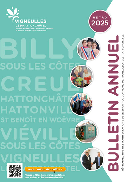 Élections municipales : 15 et 22 mars 2026 Vous avez jusqu’au 6 février 2026 pour vous inscrire sur les listes électorales. En savoir plus Bien vivre sous les Côtes de Meuse Accès rapide Les publications Papiers d’identité Nouveaux arrivants Activités jeunesse Tri des déchets Location de salle Numéros d’urgence Informations municipales Flash InfoNouveaux horaires d’ouverture de la Mairie La mairie vous accueille les lundis de 13h30 à 16h30, les mardis, mercredis et jeudis de 9h00 à 12h00 et les vendredis de 8h00 à 12h00.Élections municipales 2026Les élections municipales auront lieu les 15 et 22 mars. Date limite d’inscription sur les listes électorales : 6 février. Bonne année 2026 ! Lire la suite Une nouvelle boîte à livres à Vigneulles Durant les vacances de la Toussaint, une jolie cabane à livres a pris place au cœur du village. Lire la suite Voir les dernières informations municipales Bulletin municipal Télécharger le dernier numéro Consulter le dernier numéro Voir toutes les publications municipales À la Une Programme d’activités vacances d’hiver 2026 (Février) Frelons asiatiques, que faire si vous voyez un nid ? Élections municipales : 15 et 22 mars 2026 Un centre de distribution des Restaurants du Coeur à Vigneulles Comptes rendus des conseils municipaux Une commune riche de ses 7 villages Vigneulles-lès-Hattonchâtel Hattonville Hattonchâtel Saint-Benoit-en-Woëvre Creuë Viéville-sous-les-Côtes Billy-sous-les-Côtes Vigneulles-lès-Hattonchâtel Hattonville Hattonchâtel Saint-Benoit-en-Woëvre Creuë Viéville-sous-les-Côtes Billy-sous-les-Côtes 1600 habitants 62 km2 15 ha de vignes 1600 ha de forêt Découvrir Vigneulles-lès-Hattonchâtel 191 habitants Découvrir Hattonville 102 habitants Découvrir Hattonchâtel 42 habitants Découvrir Saint-Benoit-en-Woëvre 221 habitants Découvrir Creuë 219 habitants Découvrir Viéville-sous-les-Côtes 119 habitants Découvrir Billy-sous-les-Côtes Vie de la commune Le rajeunissement de la forêt communale de Vigneulles-Lès-Hattonchâtel Lire la suite Changement d’enseigne pour le supermarché de la commune Le magasin Colruyt changera de propriétaires au premier trimestre 2026 et sera repris sous l’enseigne Intermarché Lire la suite Voir tous les articles sur la vie de la commune Consulter et partager des informations Consulter les informations de l’écran LED Proposer une information pour le panneau LED Au cœur des Côtes de Meuse et interconnectée à sa région Tourisme Mobilité